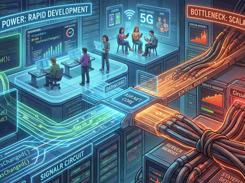 Blazor Server keeps the application’s logic on the server while maintaining a persistent WebSocket connection to the client. The UI is rendered on the server and sent to the client via SignalR (a real-time web framework). This architecture is highly efficient in terms of initial load but requires a continuous network connection to work properly.